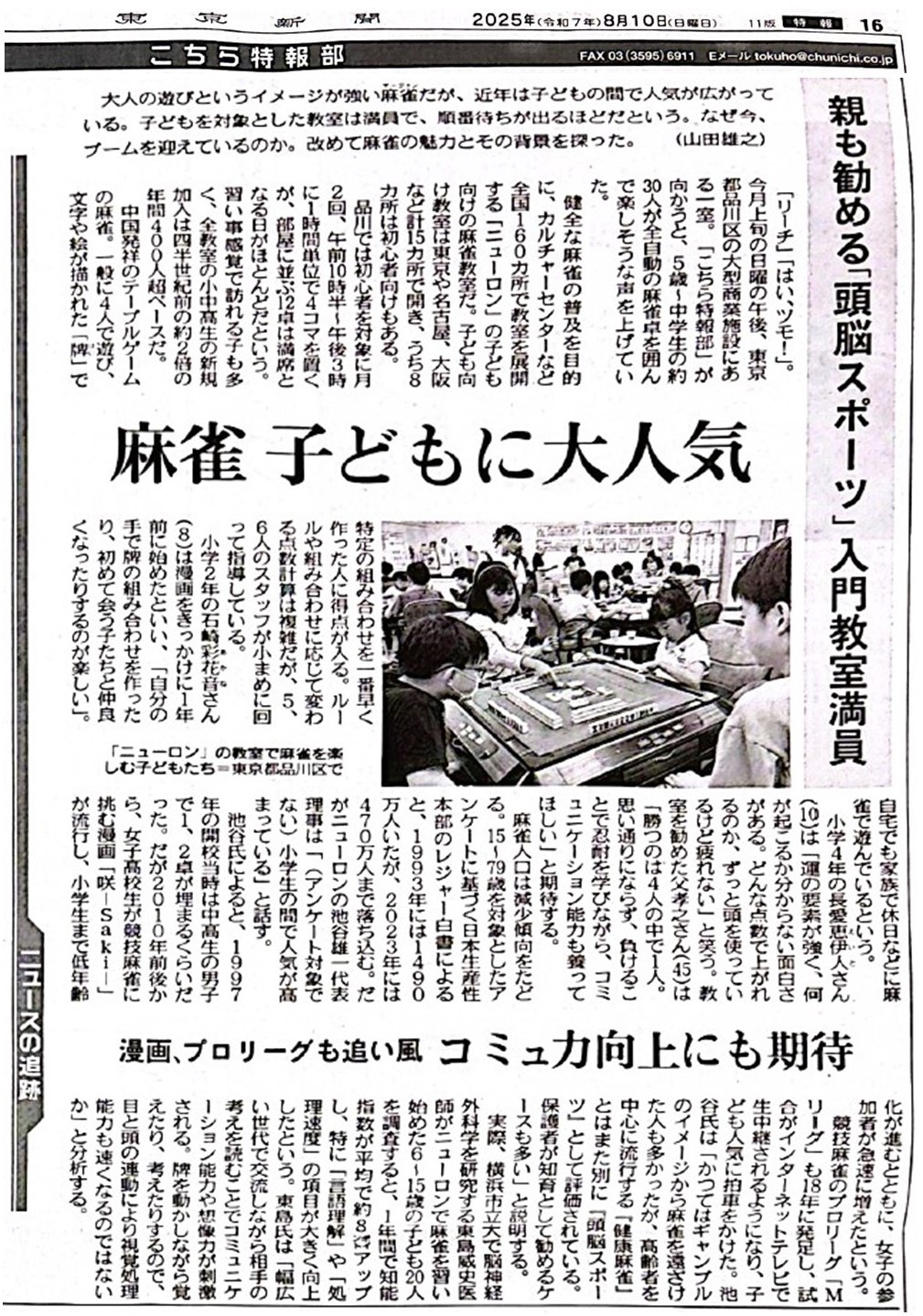 東京新聞にて「ニューロン子供麻雀教室 東京」が紹介されました。
