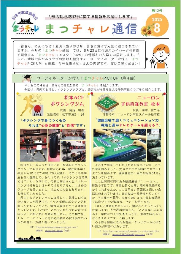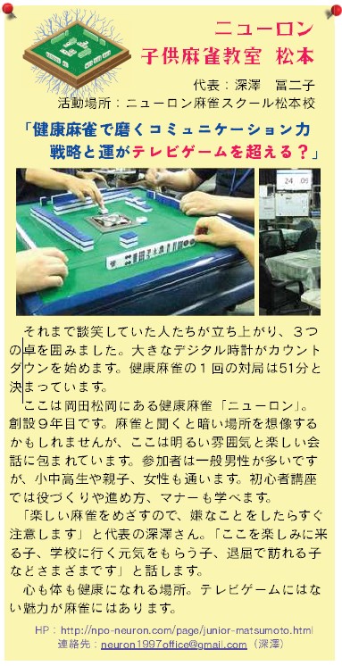 長野県の松本市および松本市教育委員会による、中学生クラブ活動支援「まつチャレ」の会報誌「まつチャレ通信」に、登録団体であるニューロン子供麻雀教室 松本の紹介記事が掲載されました。