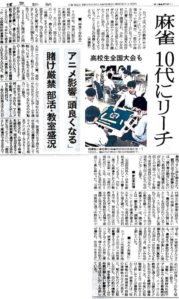 全国16か所で子ども向けの教室を開く「ニューロン麻雀スクール」は、賭け事とは一線を画す「頭脳スポーツ」として麻雀の普及に力を入れる。生徒は数年前から増え続け、今では計約2500人に上るという。7月下旬、東京都品川区の教室をのぞくと、約50人の小中学生が真剣な表情で麻雀牌と向き合っていた。
