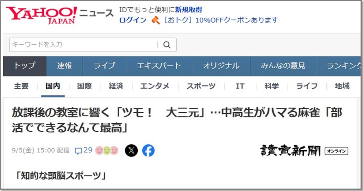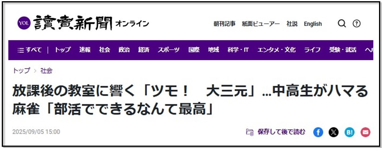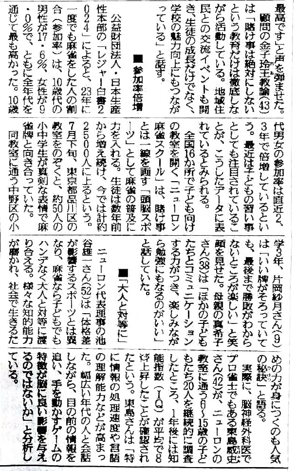 読売新聞にてニューロン子供麻雀教室 東京およびIQ論文が紹介されました。