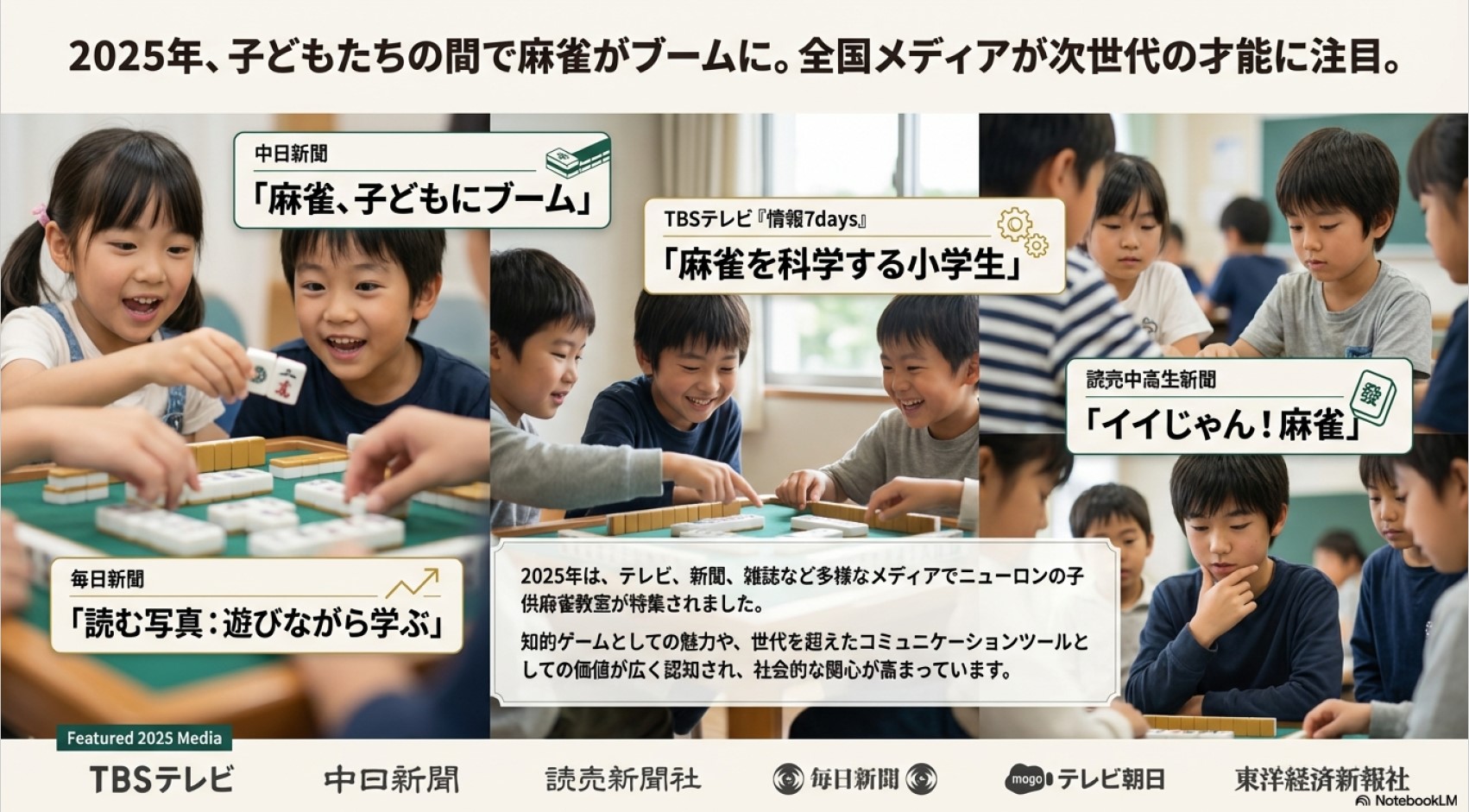 多くのテレビ、新聞、雑誌などのメディア露出を通じ、麻雀に対する社会的な認知を「ギャンブル」から「知的な文化活動」へと変容させる役割を担っています。特に「麻雀を科学する小学生」といった報道は、この活動の教育的価値を象徴しています。