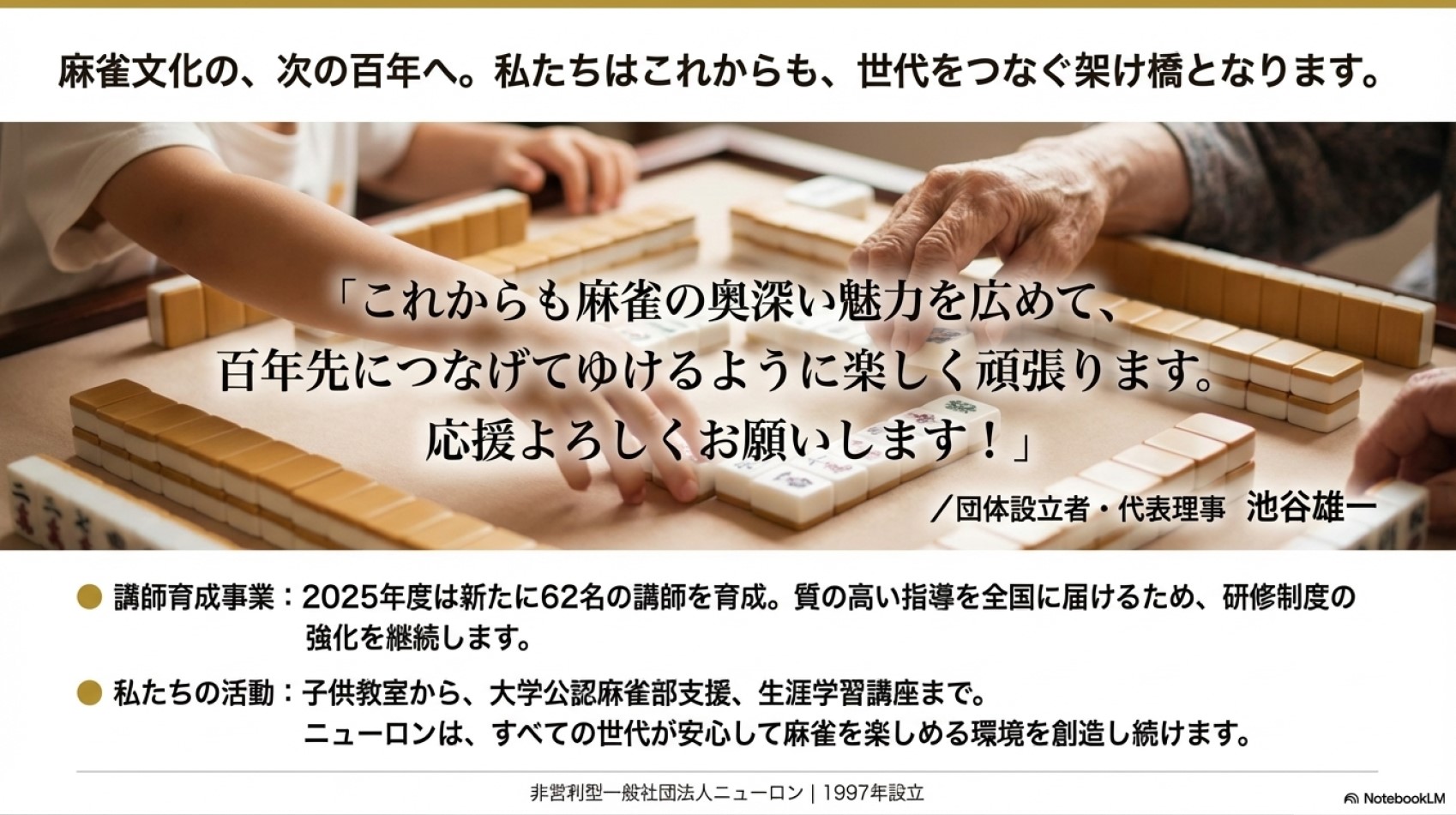 一般社団法人ニューロンは、1997年の設立以来、「健全な麻雀文化の普及」を中核に据え、多角的な教育的役割と社会的価値を追求し続けています。