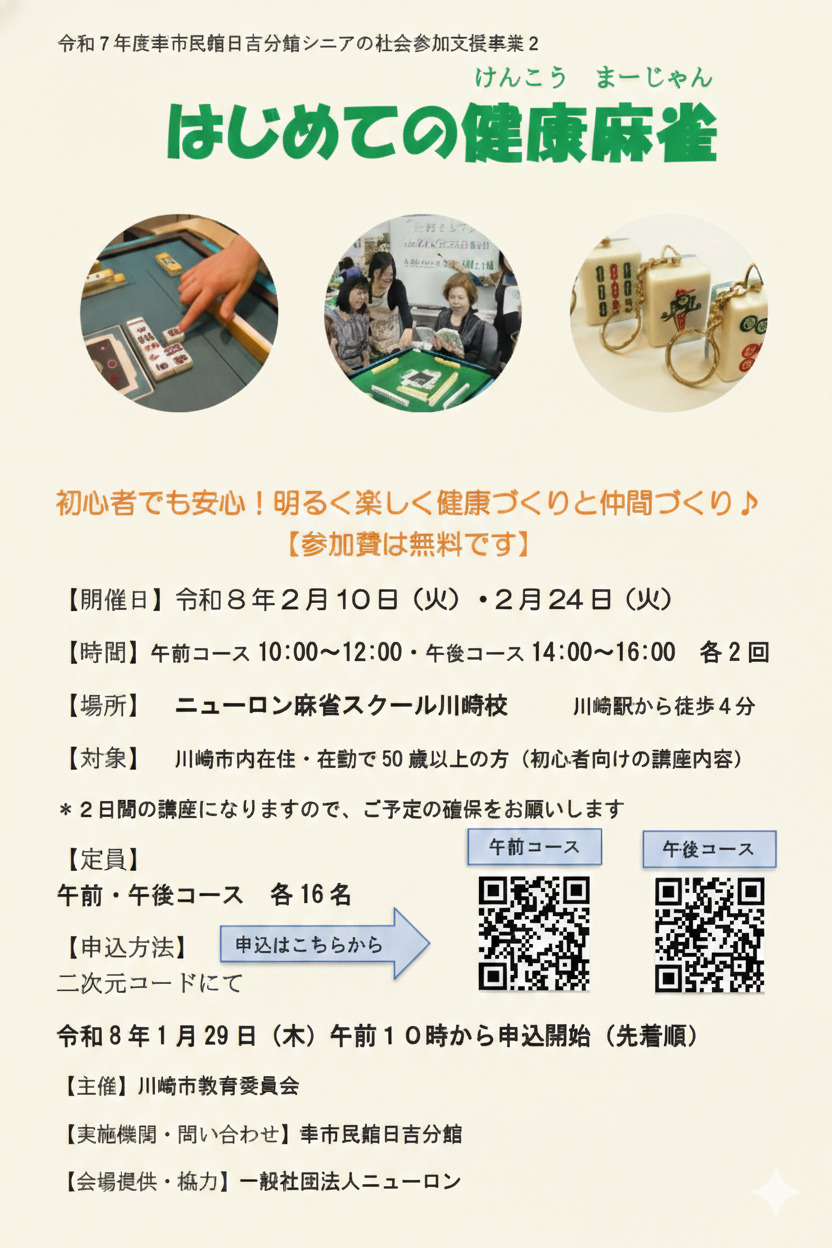 ・以前より、麻雀はやってみたいと思っていましたが、なかなか機会がなく‥‥。今回、自治体が開催してくれた教室に参加し、とても良い印象だったので、引き続き、ニューロン麻雀スクールで習ってみようと思いました。とても楽しかったです。ありがとうございました。