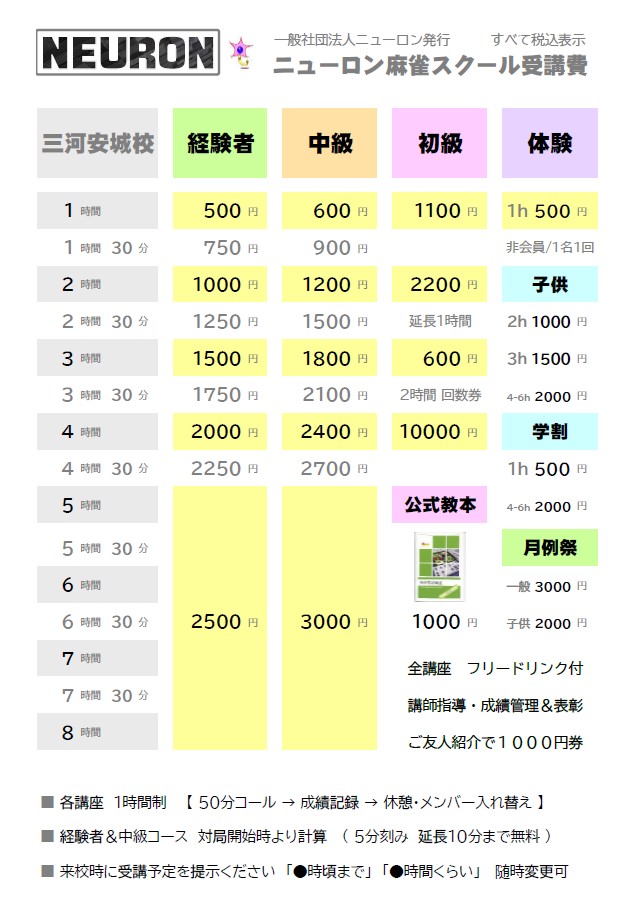 🔵2h1000円 3h1500円 4h-6h2000円